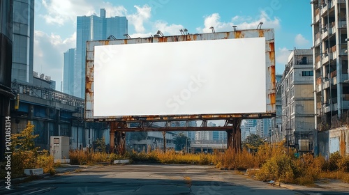 template, advertisement, advertise, advertising, banner, billboard, marketing, media, blank, board, background, building, business, city, commercial, communication, design, display, downtown, exterior, frame, information, modern, perspective, public, signboard, skyscraper, space, square, tower, urban, architecture, empty, white, office, decay, weed, abandoned, infrastructure, metal, rust, sky, cloud, landscape