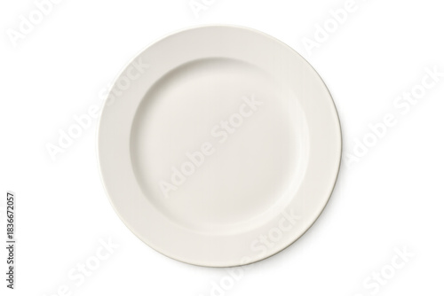 Empty white ceramic dinner plate, round dish tableware for serving food, top view with transparent background