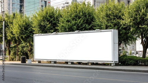Empty white hoarding stands on city street. Green trees line up behind blank billboard. Urban setting. Ideal for advertising. Modern structure. Blank space ready for poster.