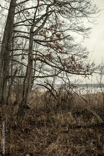 empty winter forest in winter with no snow and no tree leaves. park walkway