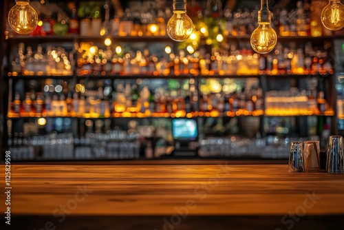 Empty wooden bar counter with blurred background of liquor bottles and warm lighting.