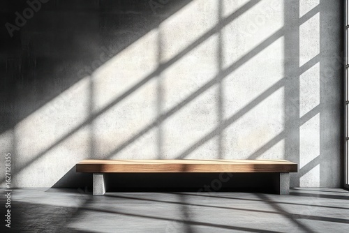 Empty wooden bench casting strong geometric shadows on a concrete floor and wall in a minimalist room with bright natural light