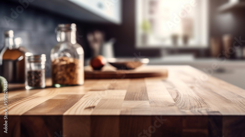 Empty wooden kitchen countertop with copy space over kitchen background.for product display montage. AI Generation.
