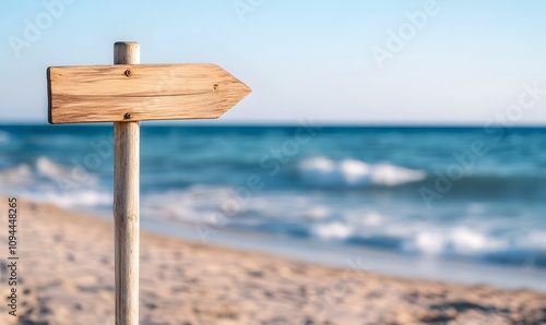 Empty wooden signpost on beautiful beach by the ocean, Generative AI