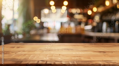 Empty wooden table with a blurred restaurant background, ideal for display and presentation purposes AI Generative.
