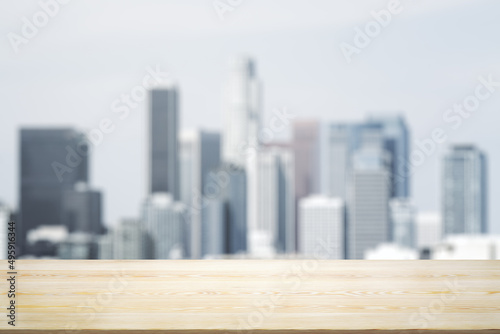 Empty wooden tabletop with beautiful blurry skyscrapers in the afternoon on background, mock up