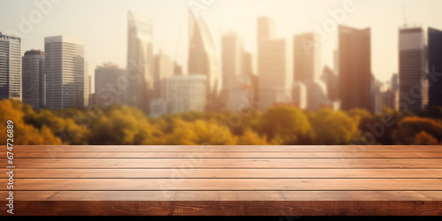 Empty wooden tabletop with blurred background of business district and office building and autumn trees. ai generative