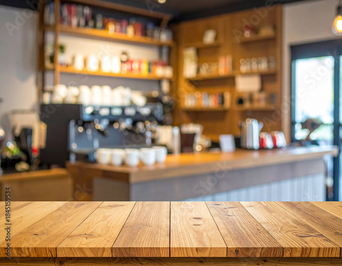 Empty wooden tabletop with blurred coffee bar and shelves background