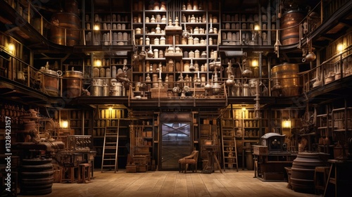 fantasy, magic, potion, alchemy, laboratory, library, antique, grand, hall, bookshelf, filled, wooden, dark, lit, vintage, old, mediaeval, magician, science, chemistry, drug, bottle, jar, equipment, study, book, barrel, shelf, stair, ladder, furniture, ancient, historical, interior, design, detail, room, home, museum, art, decor, display, rustic, light, object, cabinet
