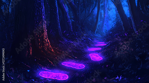 Enchanted forest trail: uv light illuminating glowing footprints in dark woods. Mystical Neon Landscapes. Illustration