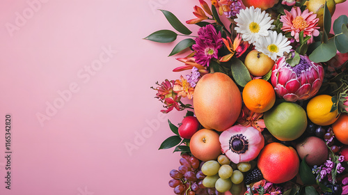 Enchanted Garden Bouquet: A Fusion of Exotic Fruits and Luxurious Florals pink background with copy space