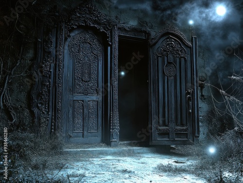 enchanted, mystical, portal, gothic, door, blue, light, surreal, midnight, forest, setting, magical, fantasy, night, mysterious, eerie, glowing, open, entrance, aethereal, dark, haunted, scenery, dreamlike, skittish, fantasy art, atmosphere, whimsical, enchanting, supernatural, wonderland, shadowy, fairy tale, adventure, twilight, wood, arch