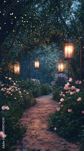 Enchanted Night Pathway with Lanterns and Blooming Flowers