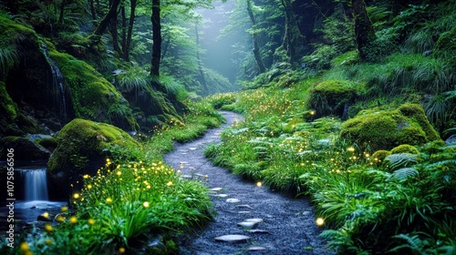Enchanted Pathway Through Lush Green Forest with Glowing Fireflies Under Soft Misty Light and Tranquil Flowing Stream in Background