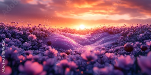 flower, sunset, field, purple, pink, fantasy, dreamlike, enchanted, magic, serenity, peace, calm, tranquil, beautiful, scenic, nature, landscape, gold, light, glow, radiant, vibrant, colours, artistic, digital, art, illustration, imagination, creative, aesthetic, wonder, beauty, harmony, dream, wonderland, heavenly, romantic, optimistic, hopeful, blissful, peaceful