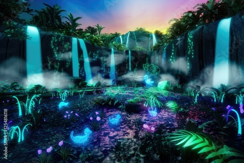 waterfall, rainforest, mystical, enchanted, twilight, glowing, flora, fauna, neon, bioluminescence, fantasy, magical, surreal, nature, jungle, tropical, night, dark, vibrant, colours, plant, animal, creature, dreamlike, aethereal, serene, calm, peaceful, digital artwork, artwork, illustration, scenery, landscape