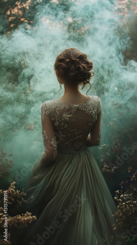 woman, dress, back, view, coiffure, smoke, green, model, fashion, photo, portrait, haze, mist, nature, elegant, beauty, style, girl, female, scene, artistic, image, picture, photo, shoot, posing, hair, clothes, clothing, apparel, texture, fabric, lace, detail, background, environment, setting, mood, atmosphere, mystical, dreamy, enchanting, magical, whimsical, fairy tale, fantasy, romantic