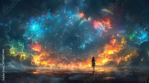 enchanting beauty of a digital watercolor graphic featuring a joyous teenage girl against the backdrop of a mesmerizing rainbow Milky Way sky, evoking a sense of dreamy