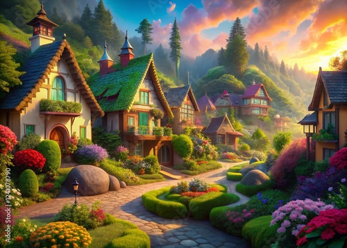 Enchanting Fantasy Village: Whimsical Houses, Lush Greenery, Magical Atmosphere