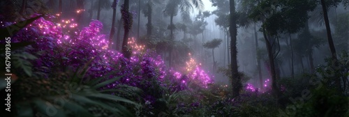 Enchanting forest scene with vibrant glowing flowers amidst dense mist and lush greenery in a magical atmosphere