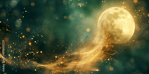 moon, glow, sparkle, night, sky, fantasy, lighting, aethereal, magical, star, full moon, celestial, luminescence, twinkle, evening, dreamlike, green, background, ambience, atmospheric, serene, tranquil, gold, particle, radiant, celestial bodies, heavenly, cosmos, shimmering, peaceful, wonder, constellations, universe, galaxy, mystical, starlight, light, bright, nature, nocturnal, illumination, beauty, mystery, allure, dream, surreal