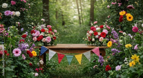 Enchanting Garden Table Display: A wooden table, adorned with vibrant floral arrangements and a charming garland, stands amidst a blossoming garden, creating a scene of serenity and natural beauty.