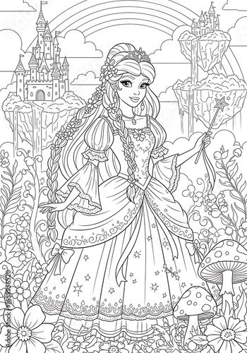 princess, fantasy, kingdom, magical, enchanting, beautiful, girl, woman, fairy tale, castle, rainbow, flower, mushroom, nature, whimsical, detailed, line art, colouring, book, page, illustration, drawing, art, creative, imagination, childhood, dream, story, adventure, royalty, crown, gown, dress, magic, wand, sparkling, serene, peaceful, happy, joy, wonder, fantasy art, creative activity, artistic