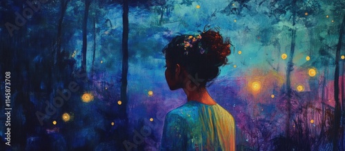 Enchanting silhouette of a girl surrounded by vibrant colors and glowing lights in a dreamy forest setting at twilight