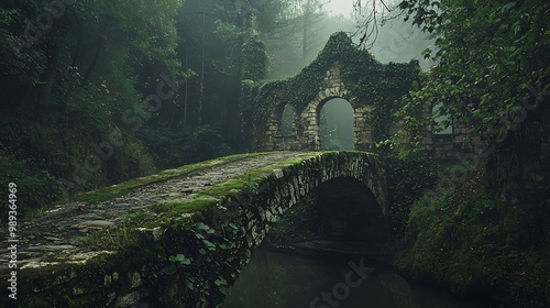 Enchanting Stone Bridge in Ancient European Forest with Ivy-Covered Ruins and Serene River Crossing