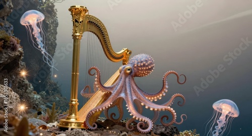 octopus, harp, underwater, fantasy, jellyfish, marine life, gold, glowing, mystical, serene, ocean, aquatic, creature, instrument, music, bioluminescence, coral, rock, sparkle, enchanting, dreamy, artistic, submarine, tentacle, deep sea, beauty, nature, tranquil, mythical