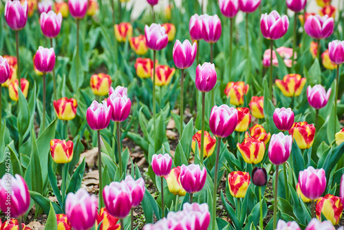 Endless pink and red tulips blossoming in spring