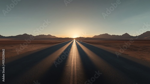 Endless road leading towards the rising sun, surrounded by serene desert landscape and distant mountain silhouette.