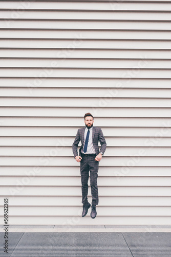 Energetic young bearded professional businessman jumping in mid-air