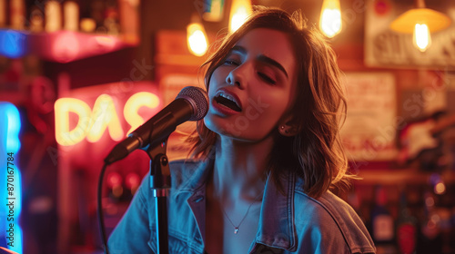 woman, singing, karaoke, bar, microphone, music, performance, young, nightlife, entertainment, stage, audience, fun, party, singer, joyful, spotlight, crowd, event, cheerful, vocal, energetic, laughter, celebration, performer, female, enjoyment, friends, vibrant, festive, social, passion, talent, indoor, excitement, trendy, youthful, song, happy, leisure, venue, neon, light, jean, jacket, hi-res