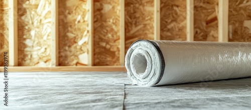 Energy Efficient Insulation Roll on Concrete Floor in Wooden Framed Interior with Natural Light and Copy Space for Text