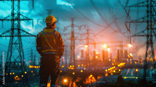 Energy engineer standing back and looking at a power plant that produces electricity. Ai generate.