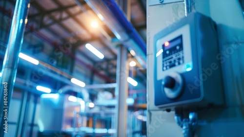 Energy-efficient HVAC control in factory, close-up, no people, digital thermostat, focused lighting