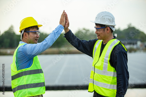Engineer and technician giving high five to each other at solar power plant