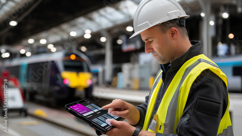 Engineer assigning roles to trainees using tablet interface, focused, training, teamwork