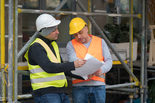 Engineer giving colleague arrangements about a new construction site. Outdoors