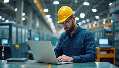 Engineer in factory reviews production data on laptop. Wears safety helmet, sits at table in modern factory. Industrial machines blurred in background. Scene shows tech worker analyzing production