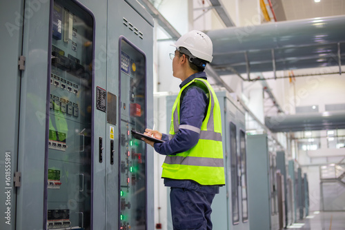 Engineer inspects local control cabinet inside electrical substation using tablet for monitoring and maintenance ensuring safety and efficiency in industrial environment