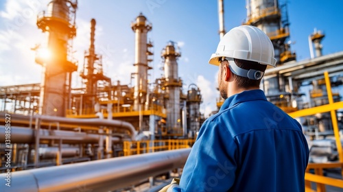 Engineer inspects refinery structures under blue sky, energy production concept