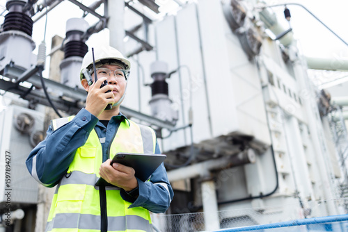 engineer, power, substation, working, high, voltage, infrastructure, inspection, check, safety, electrical, system, technician, industrial, energy, communication, radio, tablet, protective, helmet, vest, utility, maintenance, control, equipment, outdoors, professional, men at work, technology, network, connection, signal, transmission, electric, facility, industry, construction, monitoring, service, job, occupation, person, adult, male, uniform, environment, background, modern, engineering