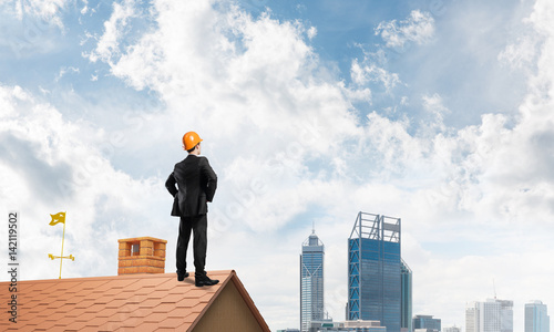 Engineer man standing on roof and looking away. Mixed media