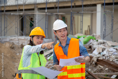 Engineer manager inspects construction sites and checking blueprints at building townhome project