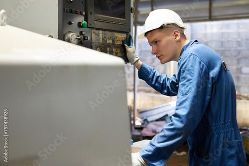 engineer or technician checking and control lathe machine in the factory