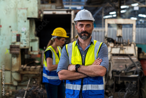 Engineers and skilled technicians are maintaining machinery. Engineers are working and repairing machines in industrial. worker while standing with arms crossed near factory.