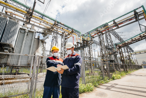 Engineers electrical substations conduct a survey of modern high-voltage equipment in the mask at the time of pandemia. Energy. Industry
