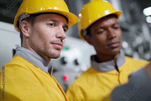 inspecting, large, industrial, equipment, digital, control, panel, highlighting, modern, technology, integration, manufacturing, process, men at work, construction, helmet, builder, hard hat, safety, work, contractor, industry, engineer, building, people, foreman, hat, job, working, occupation, man, yellow, woman, site, architecture, handyman, smiling
